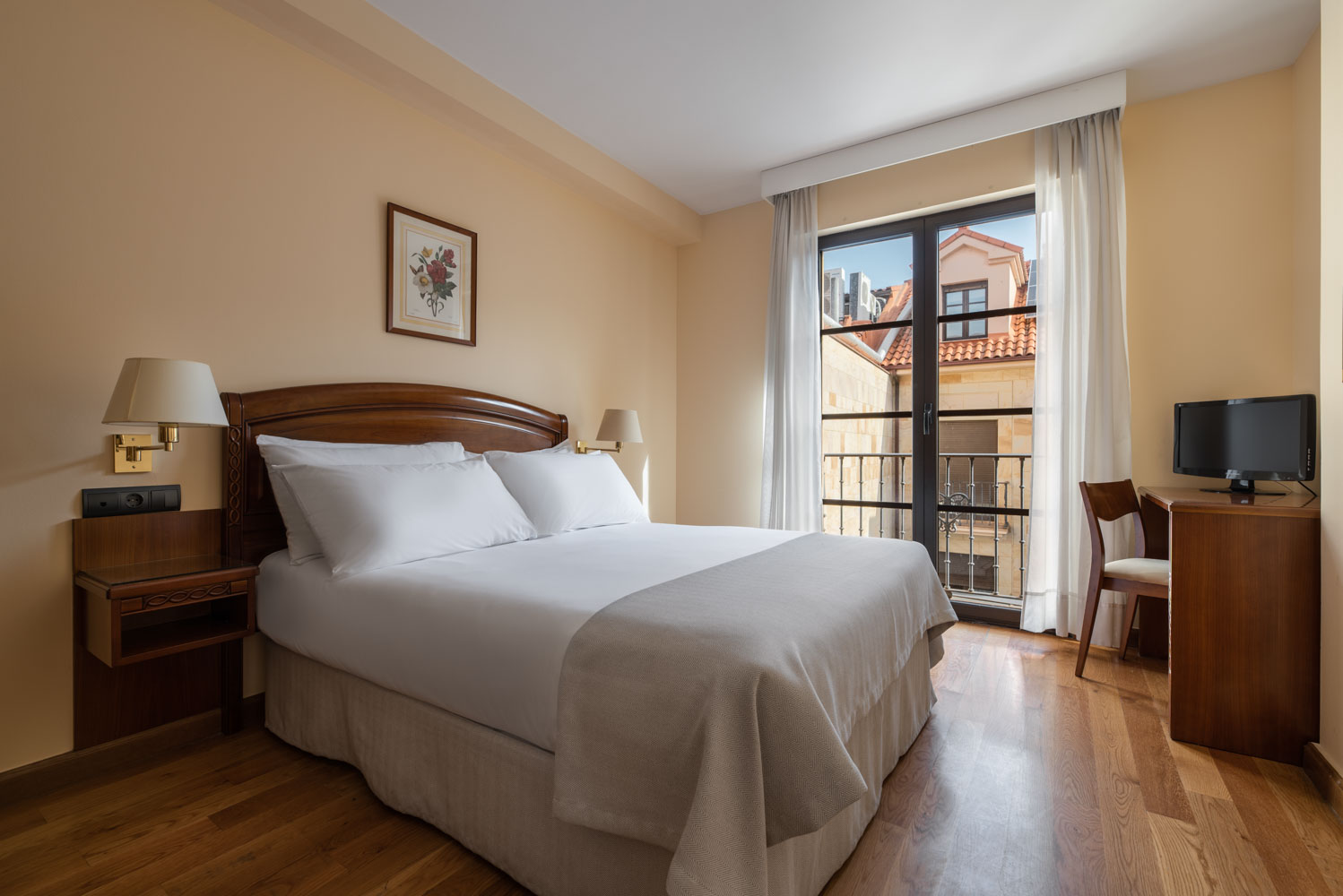 L'hotel offre camere spaziose e confortevoli decorate con legno e toni caldi, con vista sulla piazza e sul municipio, in cui riposare dopo una giornata di visite turistiche o di lavoro in città.